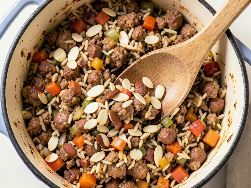 A hearty, savory casserole of browned breakfast sausage, wild rice, and toasted slivered almonds baked together with vegetables and chicken noodle soup mix for incredible depth of flavor. Cozy, crowd-pleasing, and surprisingly elegant.